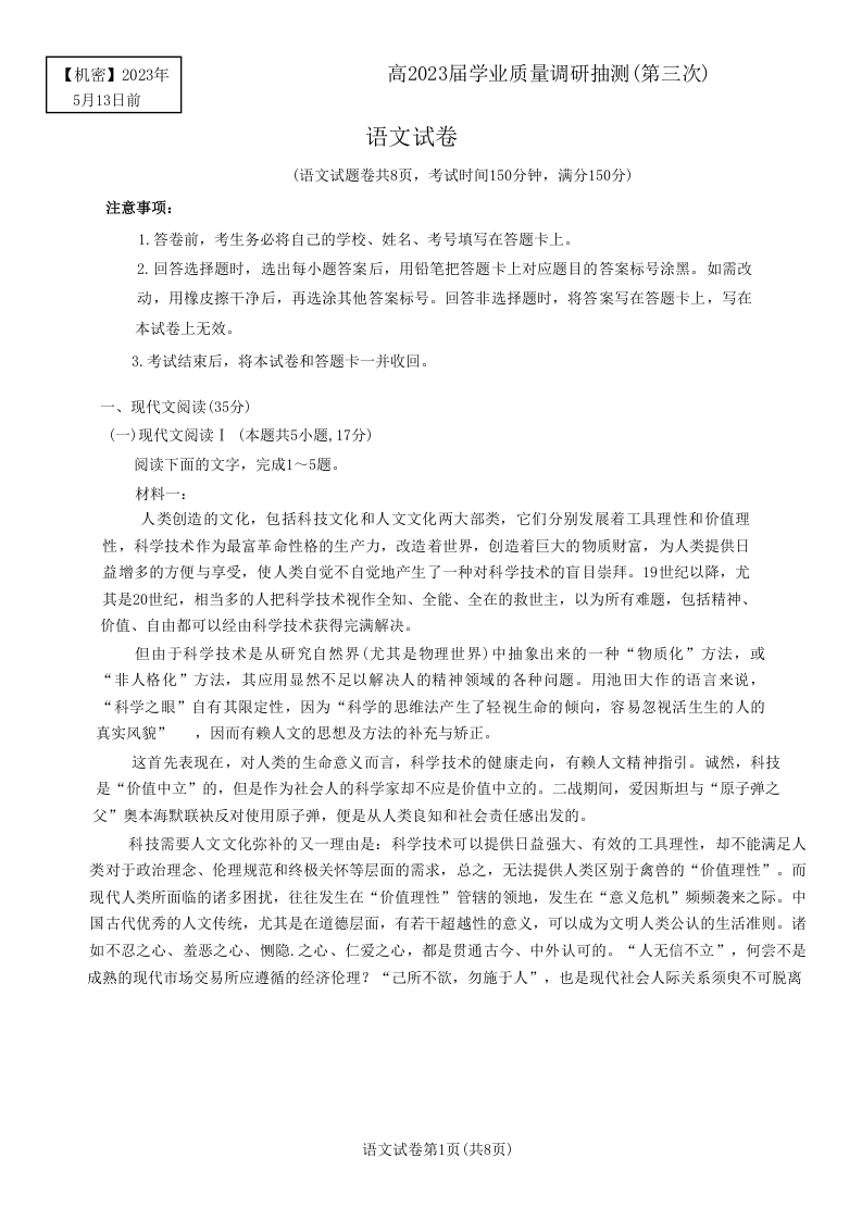高三语文--重庆三诊教科院卷 2023届学业质量调研抽测(第三次)