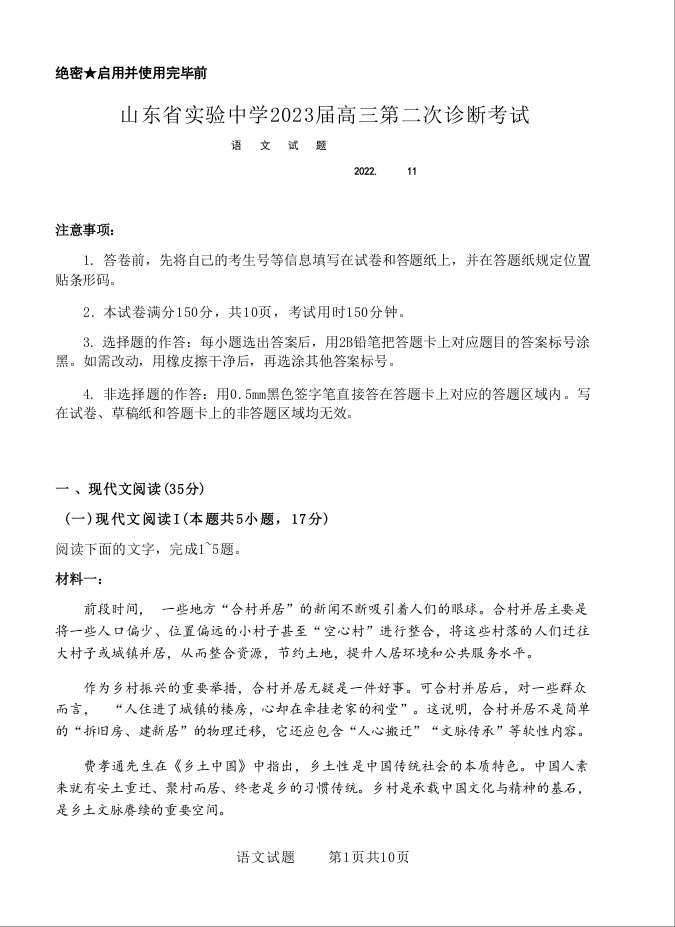 高三语文--山东省实验中学2023届高三第二次诊断考试