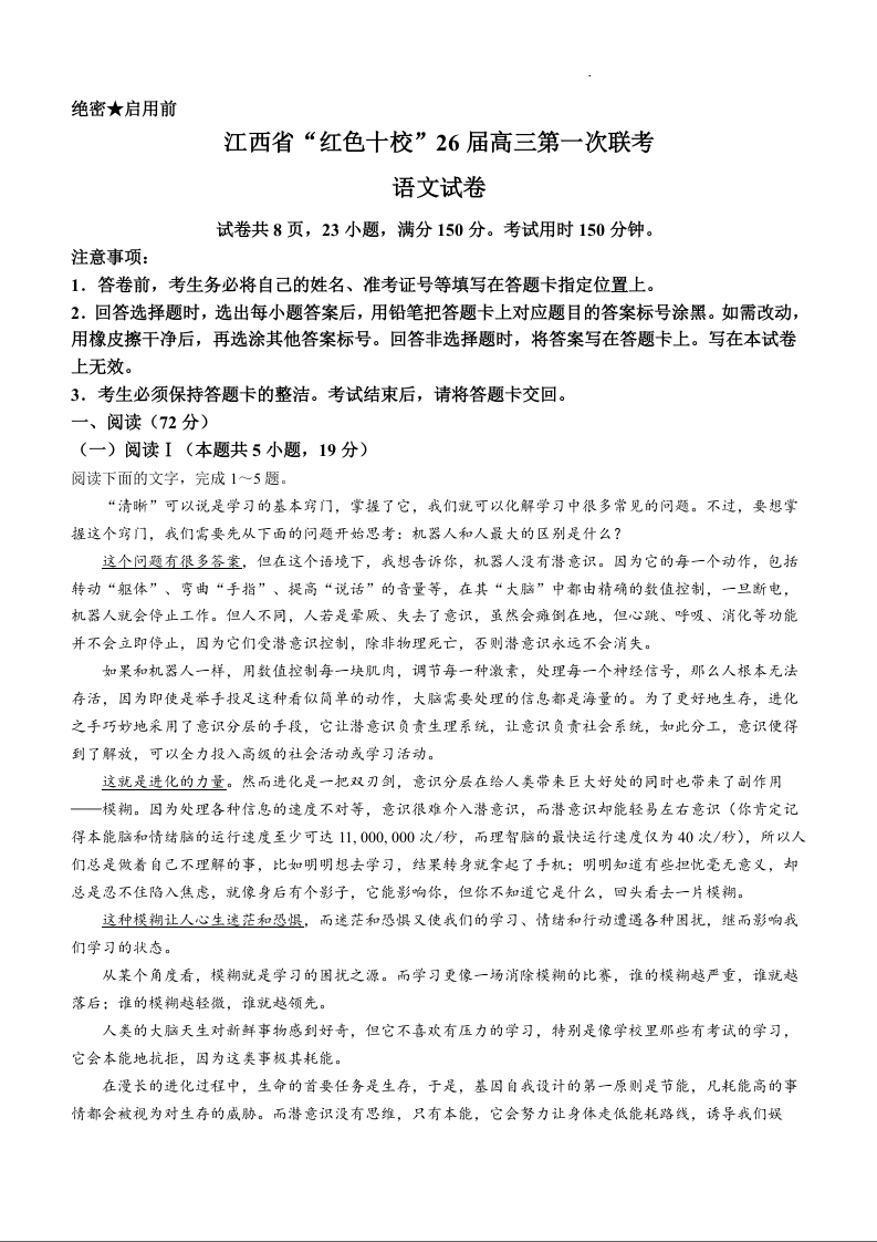 高三语文+答案--江西省“红色十校”2026届高三第一次联考