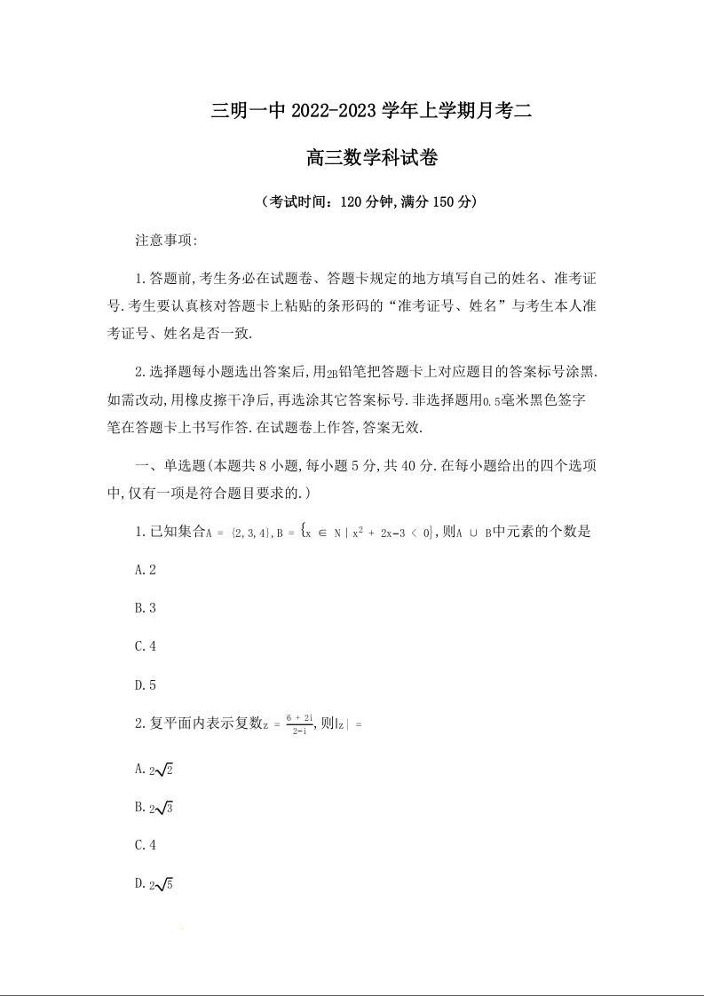 高三数学--福建省三明第一中学2023届高三上学期第二次月考