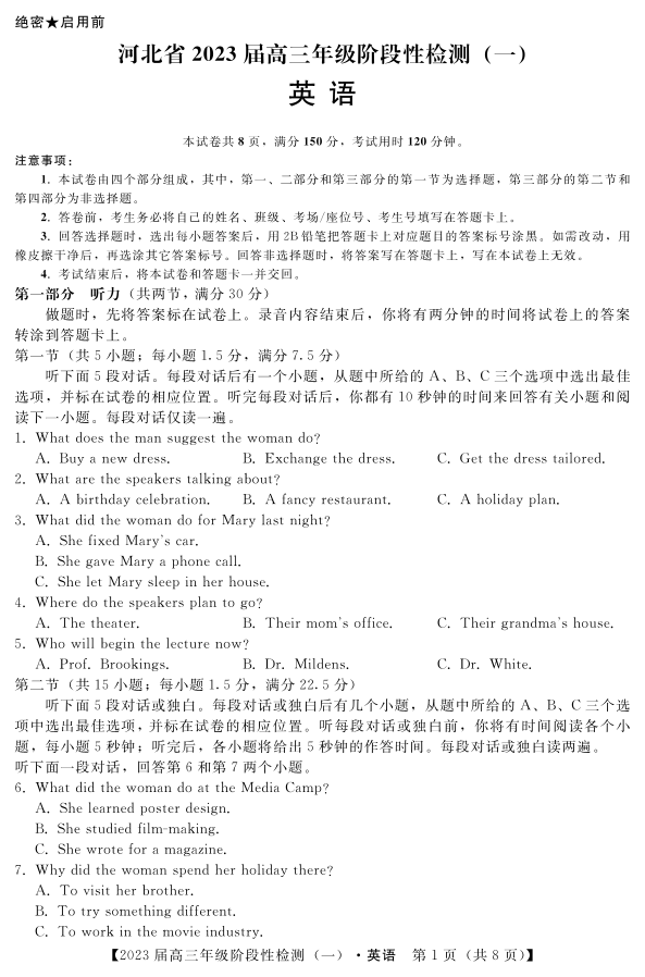 高三英语--河北省部分重点中学2023届高三上学期阶段性检测(一)