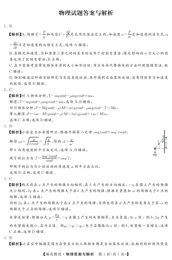 高三物理答案--河北省部分重点中学2023届高三上学期阶段性检测(一)