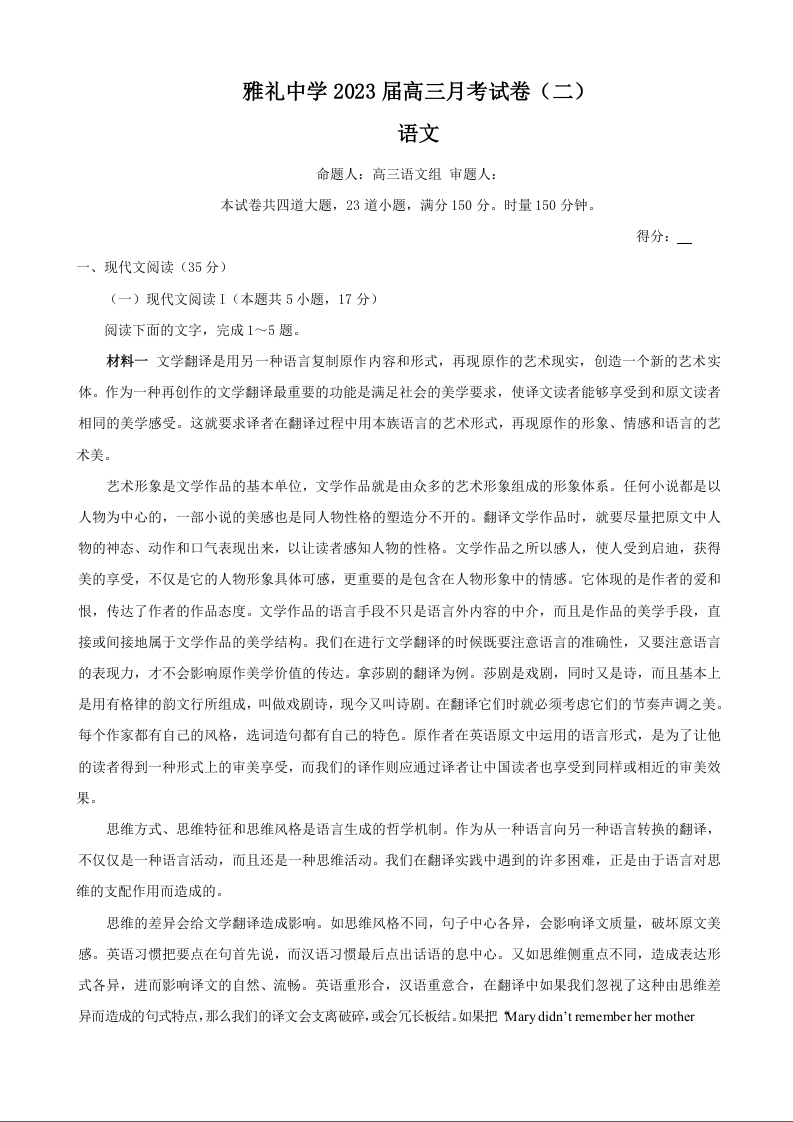 高三语文--湖南省长沙市雅礼中学2023届高三上学期月考试卷(二)