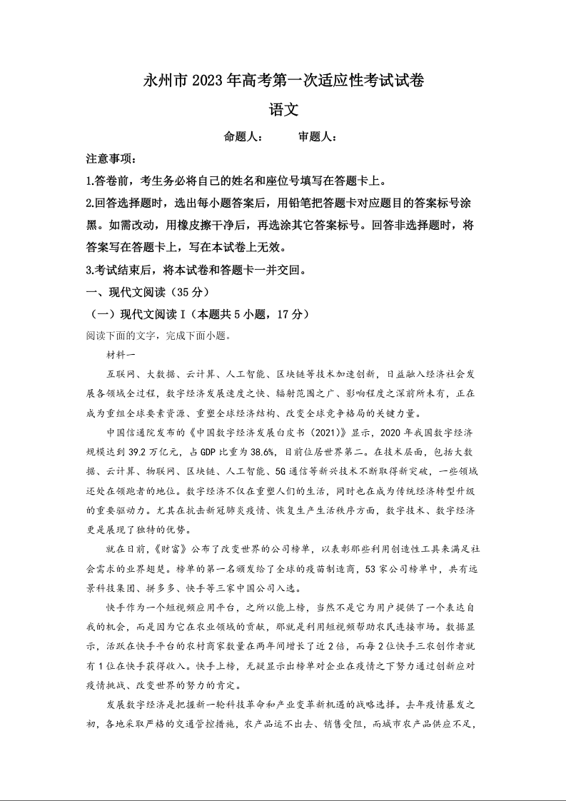 高三英语(原卷版)--湖南省永州市2023届高三上学期第一次适应性考试