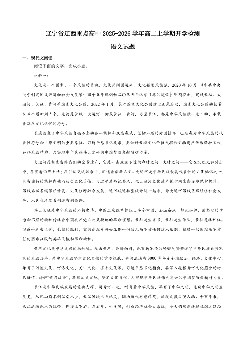 高二语文+答案--辽宁省辽西重点高中2025-2026学年高二上学期开学考试