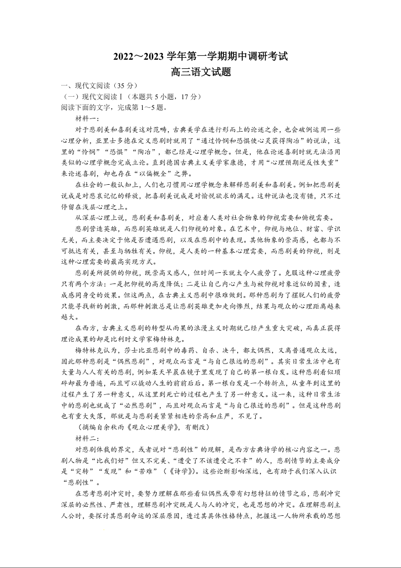 高三语文+答案--江苏省连云港市2023届高三上学期期中调研考试