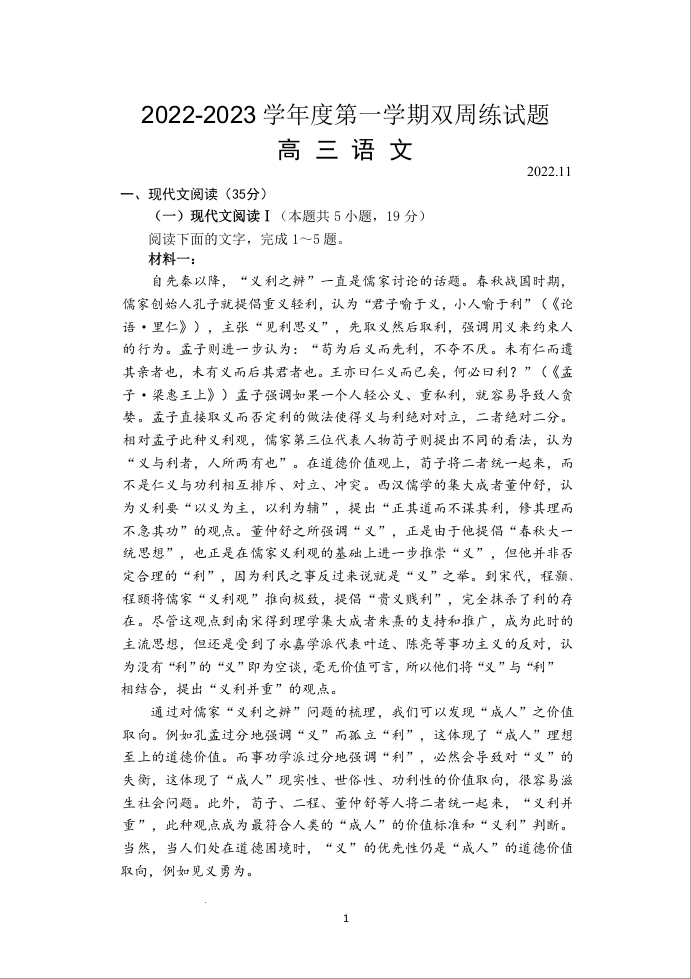 高三语文+答案--江苏省扬州中学2023届高三上学期11月双周练(月考)