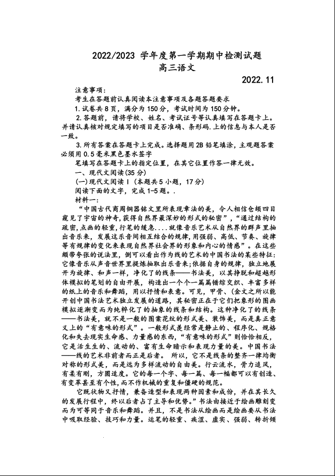 高三语文+答案--江苏省扬州中学2023届高三上学期11月期中检测
