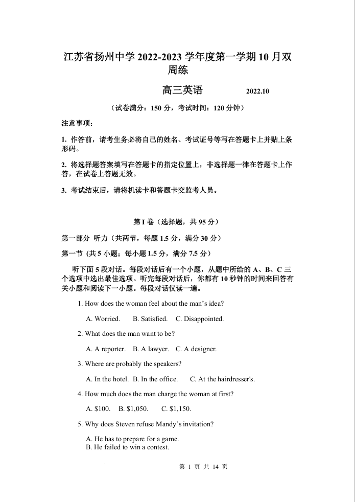 高三英语--江苏省扬州中学2023届高三上学期10月双周练(三)