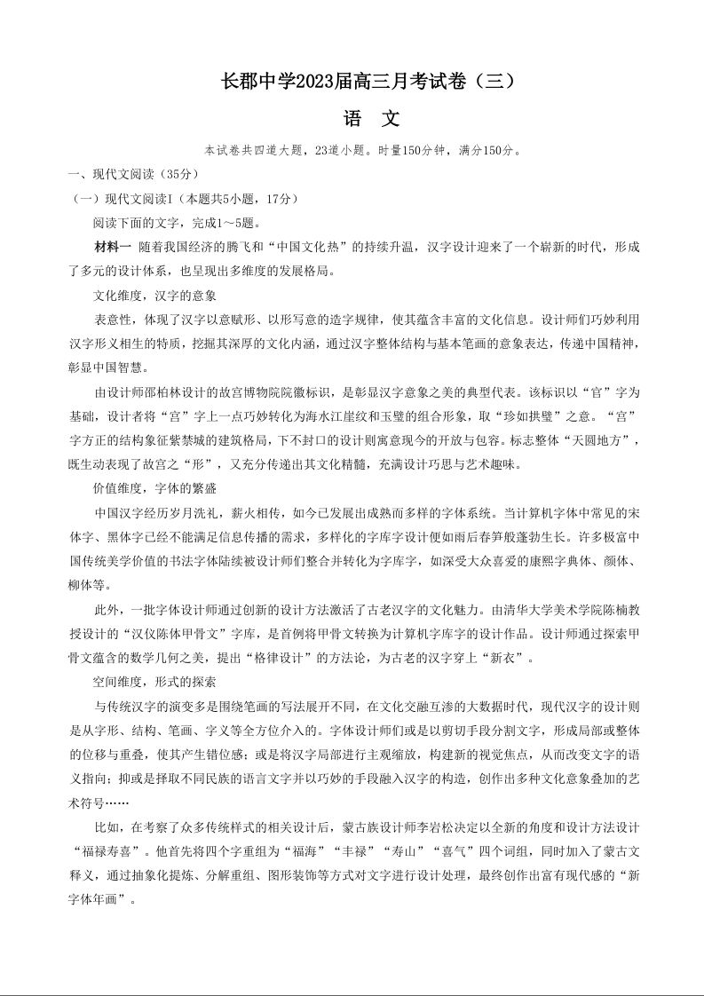 高三语文+答案--湖南省炎德英才长郡中学2023届高三月考(三)