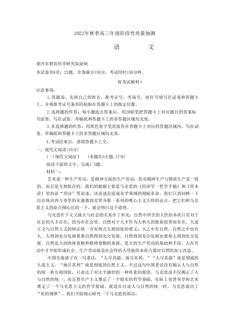 高三语文--湖北省黄冈市2023届高三上学期11月期中考试