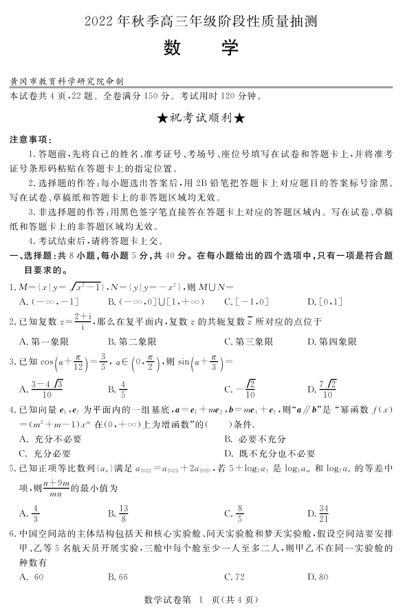 高三数学--湖北省黄冈市2023届高三上学期11月期中考试
