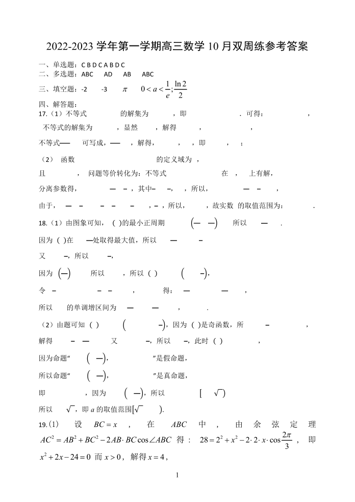 高三数学答案--江苏省扬州中学2023届高三上学期10月双周练
