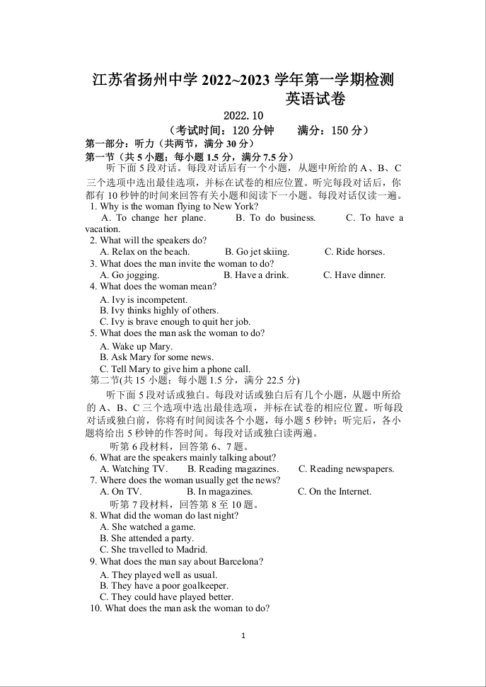 高三英语--江苏省扬州中学2023届高三上学期10月双周练