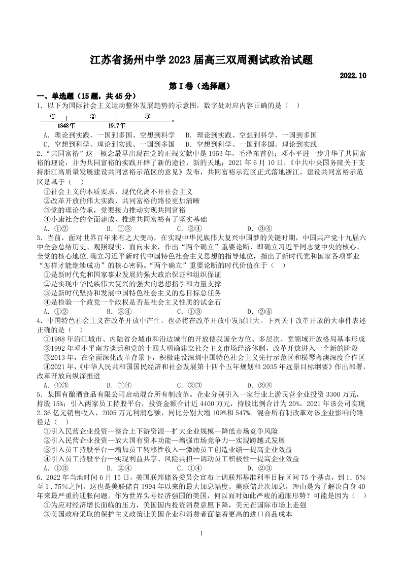 高三政治--江苏省扬州中学2023届高三上学期10月双周练