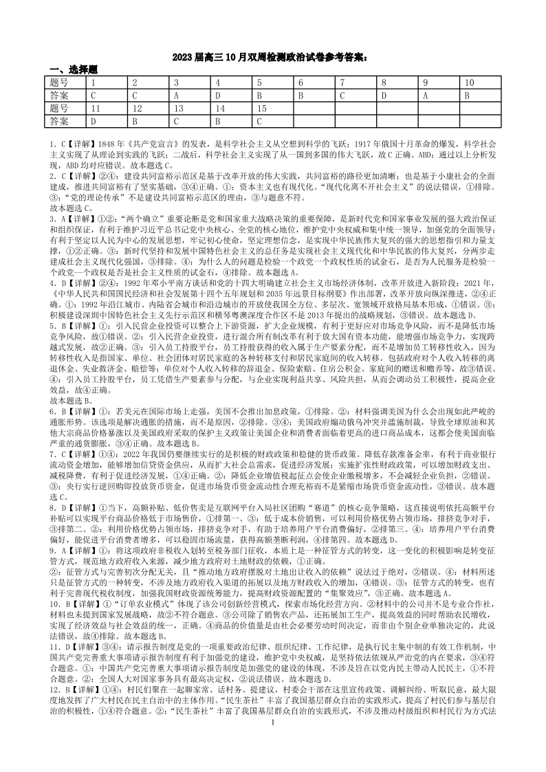 高三政治答案--江苏省扬州中学2023届高三上学期10月双周练
