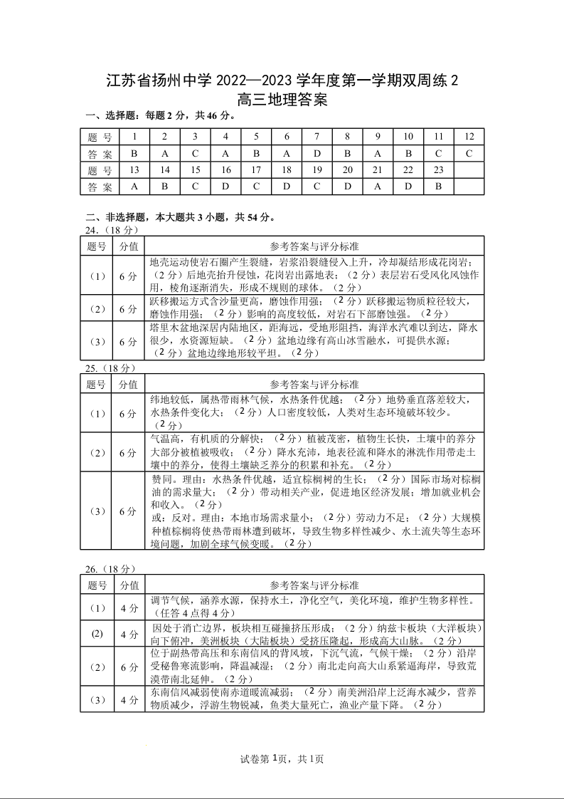 高三地理答案--江苏省扬州中学2023届高三上学期10月双周练