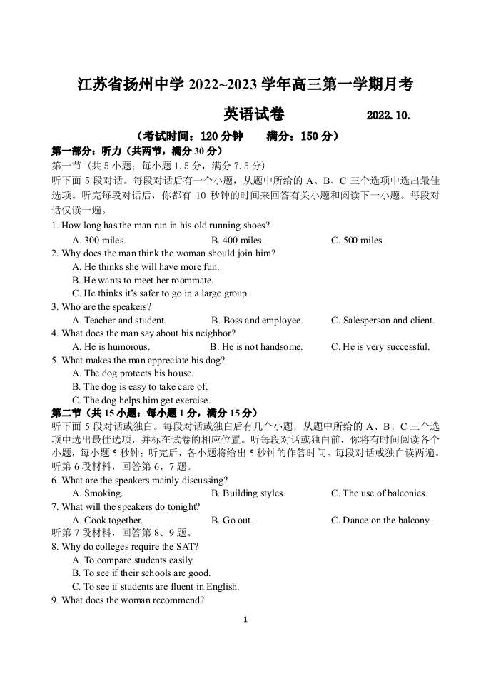 高三英语--江苏省扬州中学2023届高三上学期10月月考