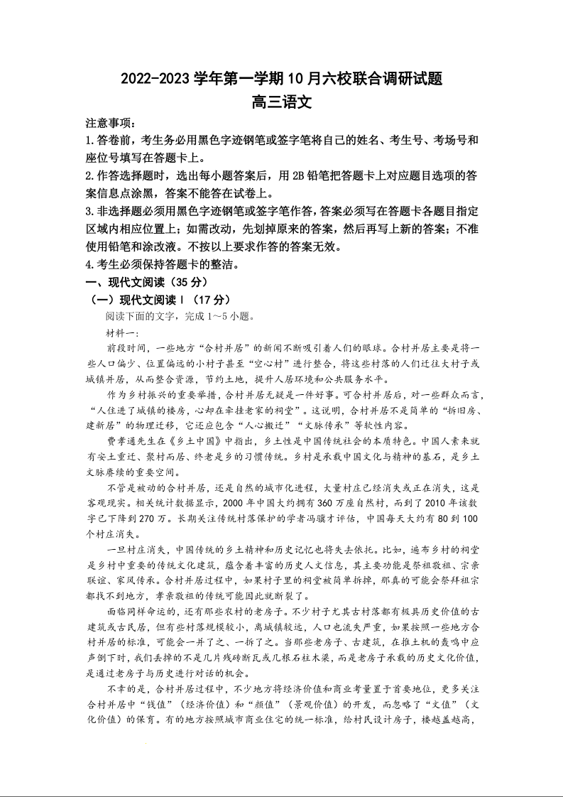 高三语文--江苏省南京市六校联合体2023届高三上学期10月联合调研