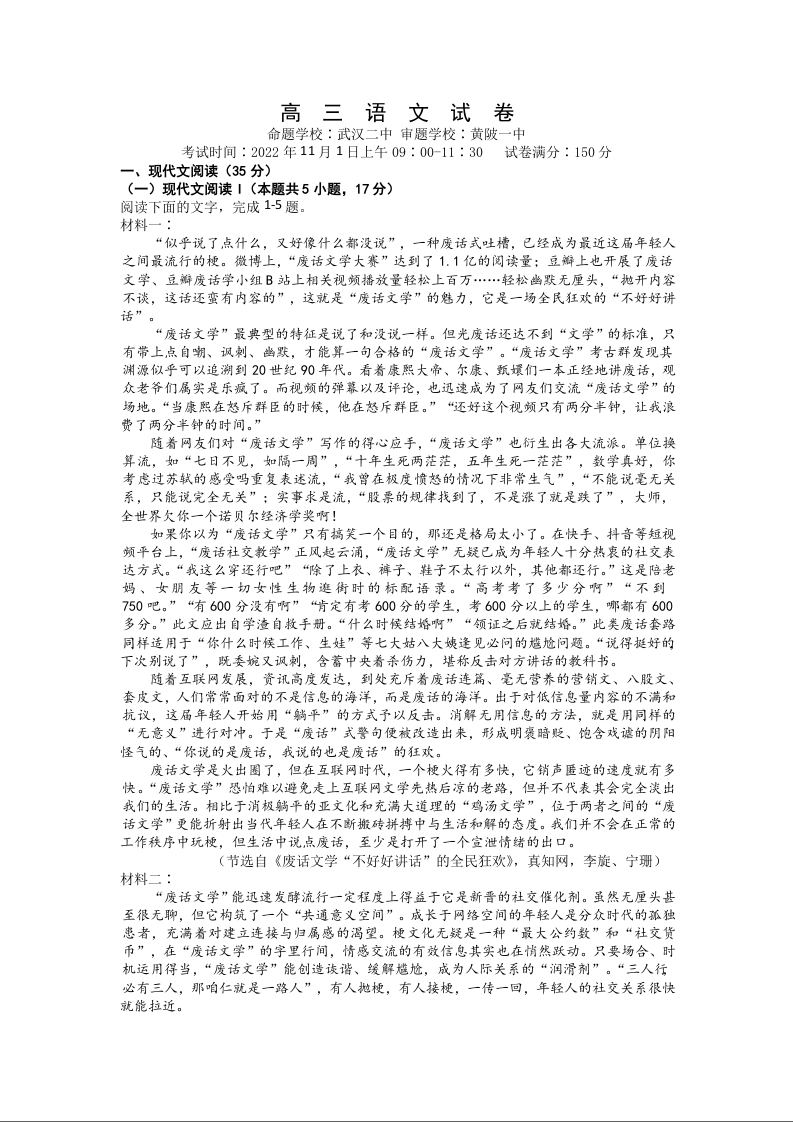 高三语文+答案--湖北省鄂东南省级示范高中教育教学改革联盟学校2022-2023学年高三上学期期中联考