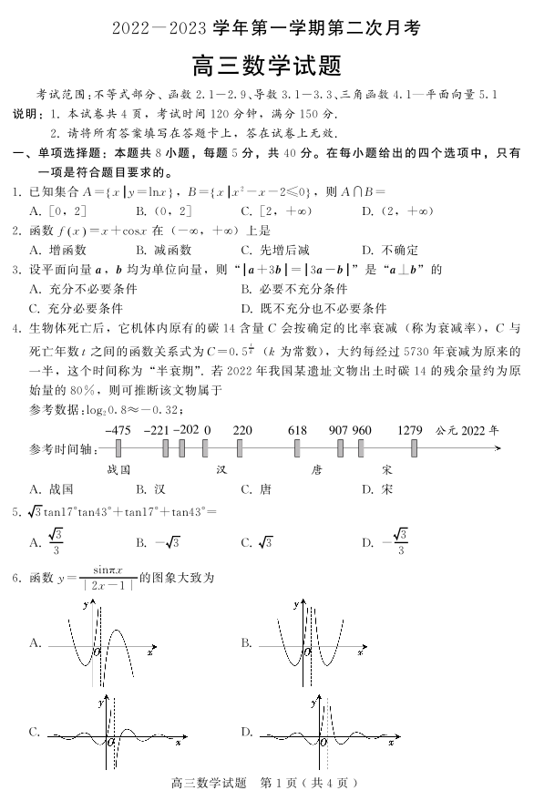 高三数学--河北省邢台市五校联考2023届高三上学期期中考试