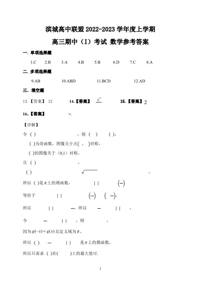 高三数学答案--辽宁省大连市滨城联盟2023卷高三上学期期中考试