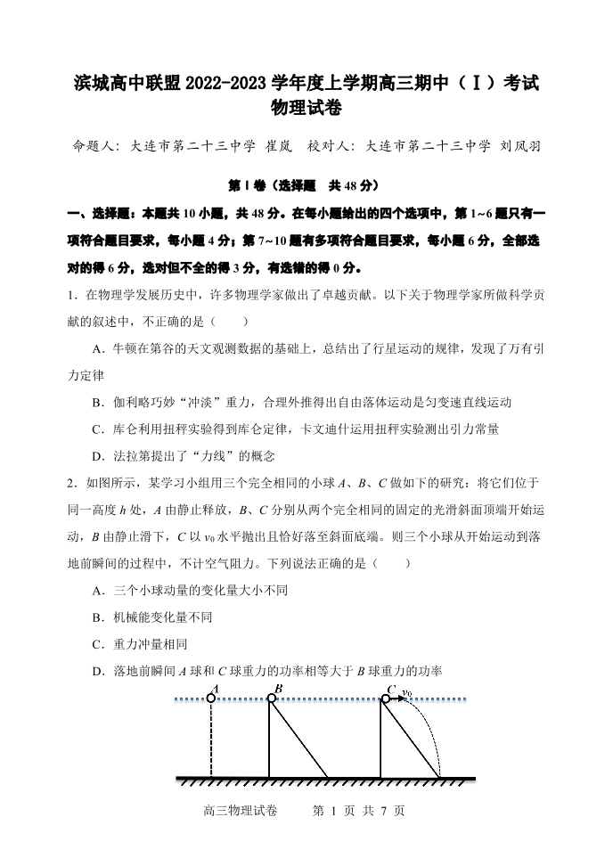 高三物理--辽宁省大连市滨城联盟2023卷高三上学期期中考试