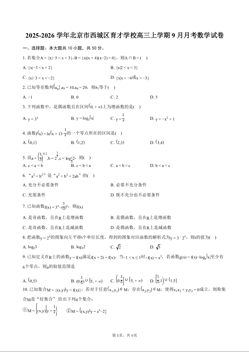 高三数学+答案--北京市西城区育才学校2026届高三上学期9月月考