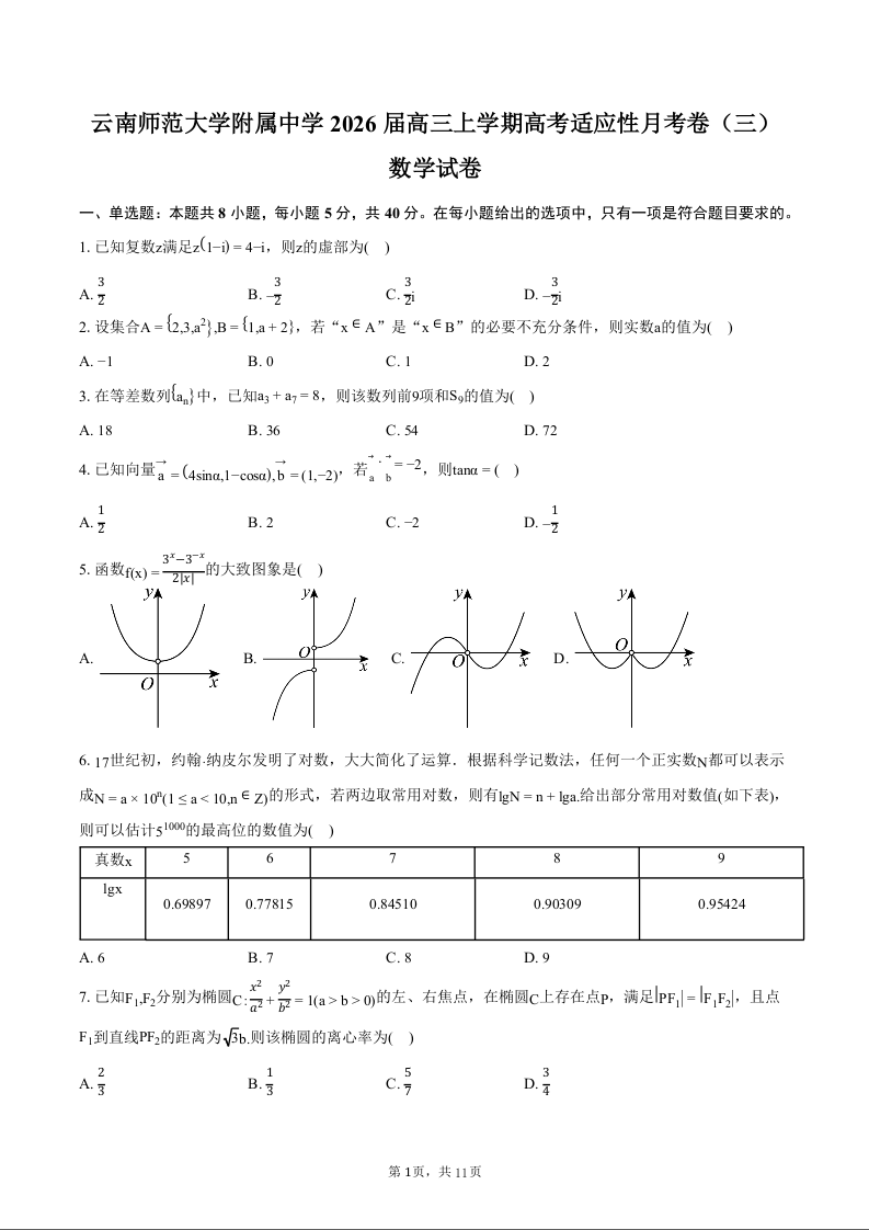 高三数学+答案--云南省昆明市云南师范大学附属中学2026届高三上学期高考适应性月考卷(三)