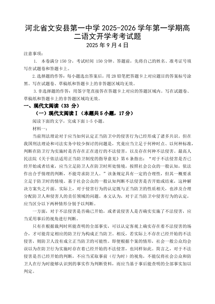 高二语文+答案--河北省廊坊市文安县第一中学2025-2026学年高二上学期开学考试