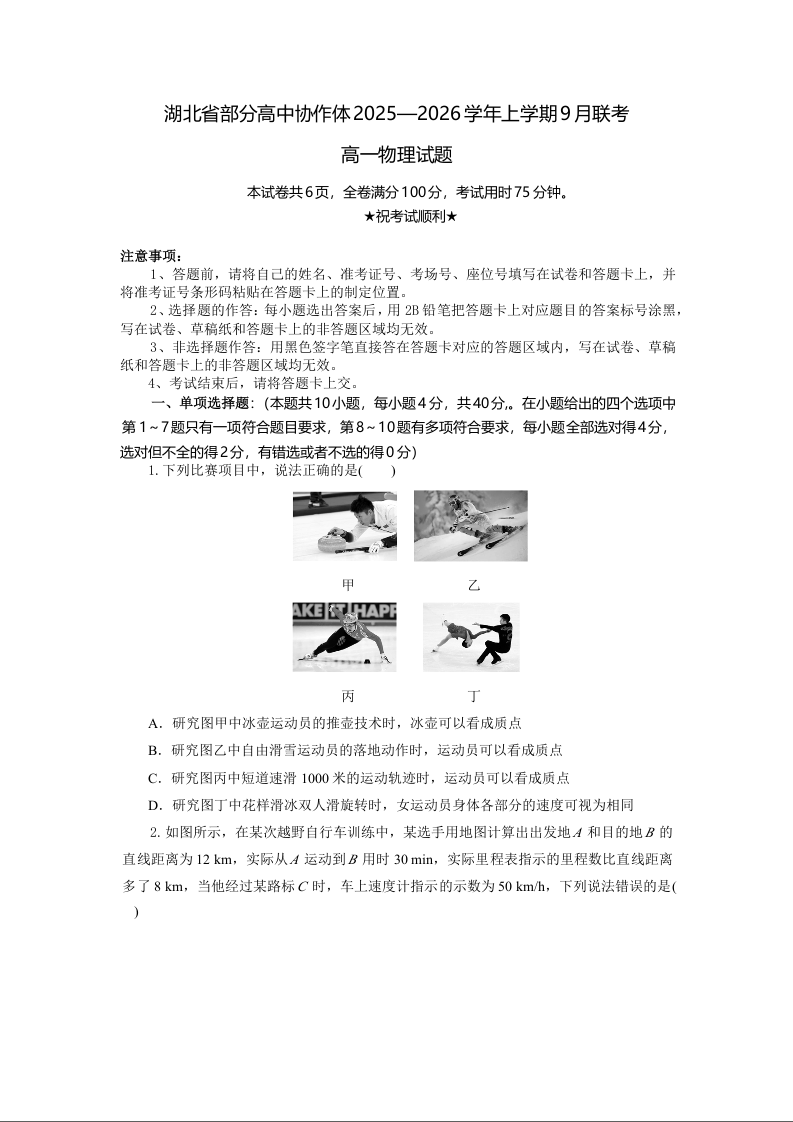 高一物理考试版--湖北省部分高中协作体2025-2026学年高一上学期9月月考