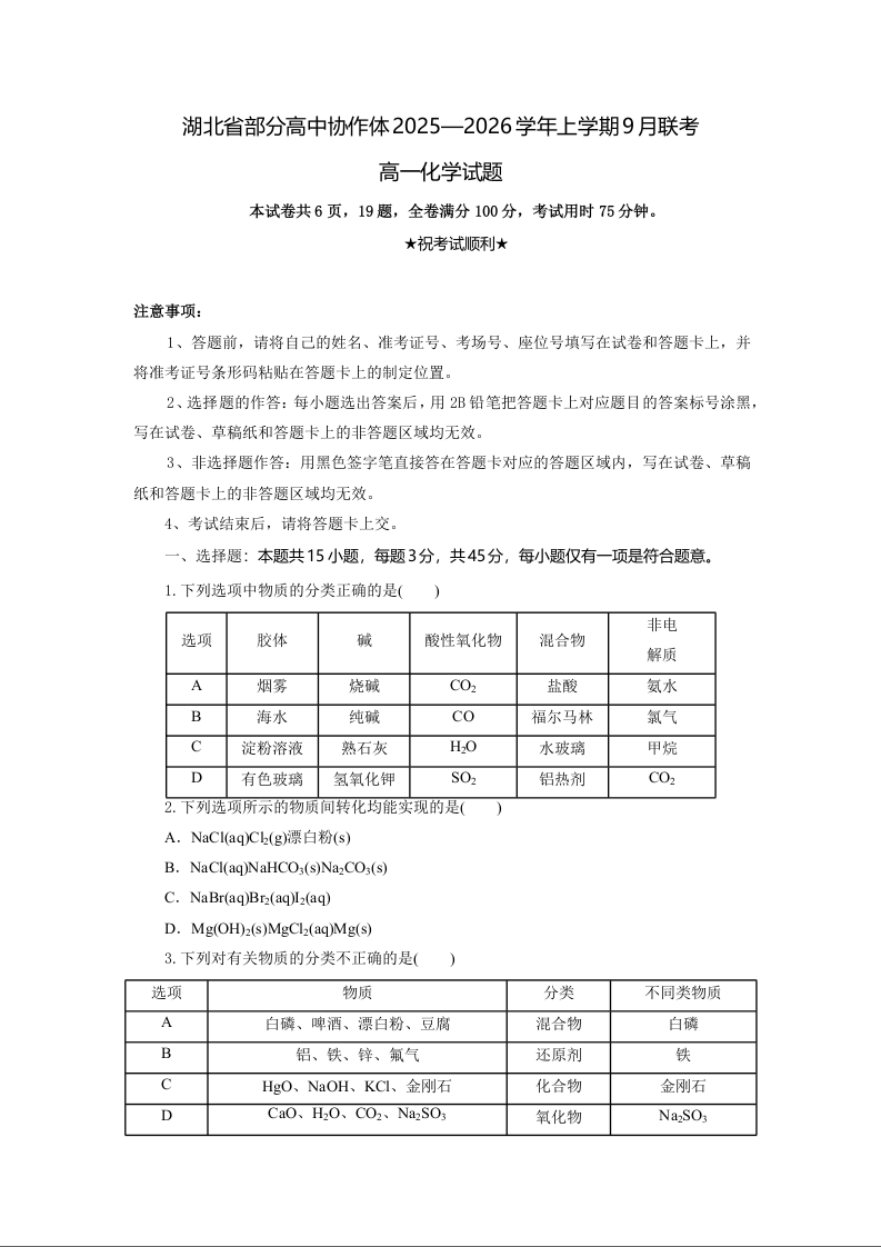 高一化学考试版--湖北省部分高中协作体2025-2026学年高一上学期9月月考