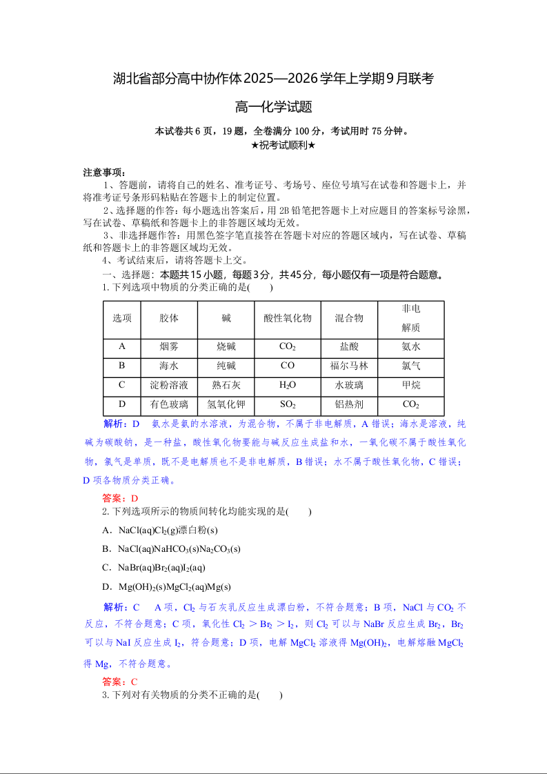 高一化学解析版--湖北省部分高中协作体2025-2026学年高一上学期9月月考