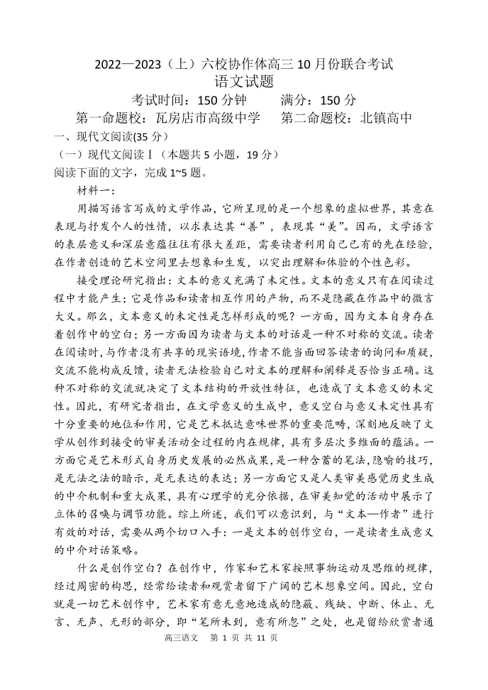 高三语文--辽宁省六校协作体2023届高三上学期10月联考