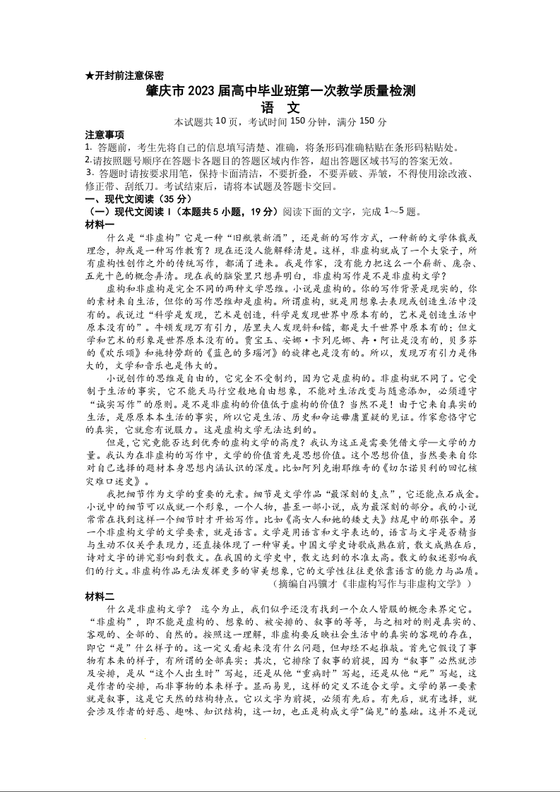 高三语文+答案--广东省肇庆市2023届高三上学期第一次教学质量检测