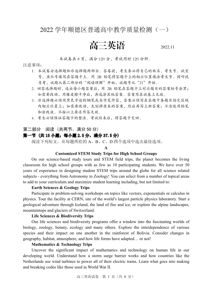 高三英语--广东省佛山市顺德区2023届高三11月教学质量检测(一)
