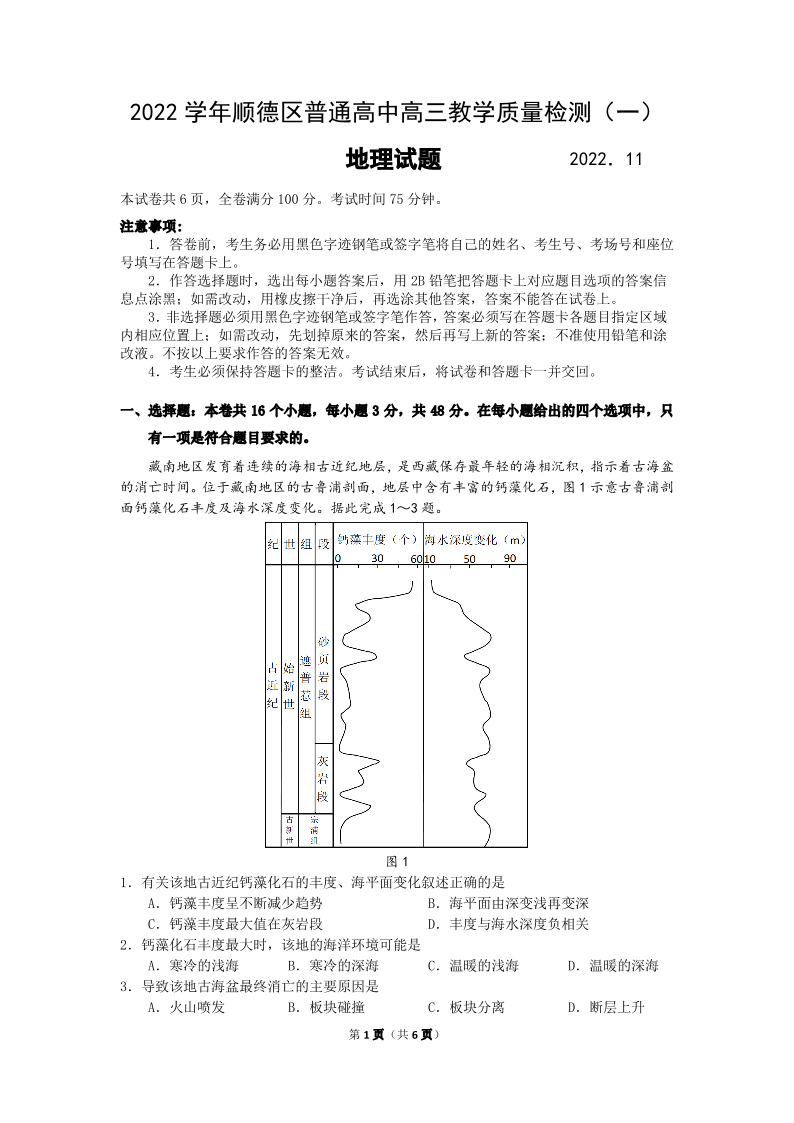 高三地理--广东省佛山市顺德区2023届高三11月教学质量检测(一)