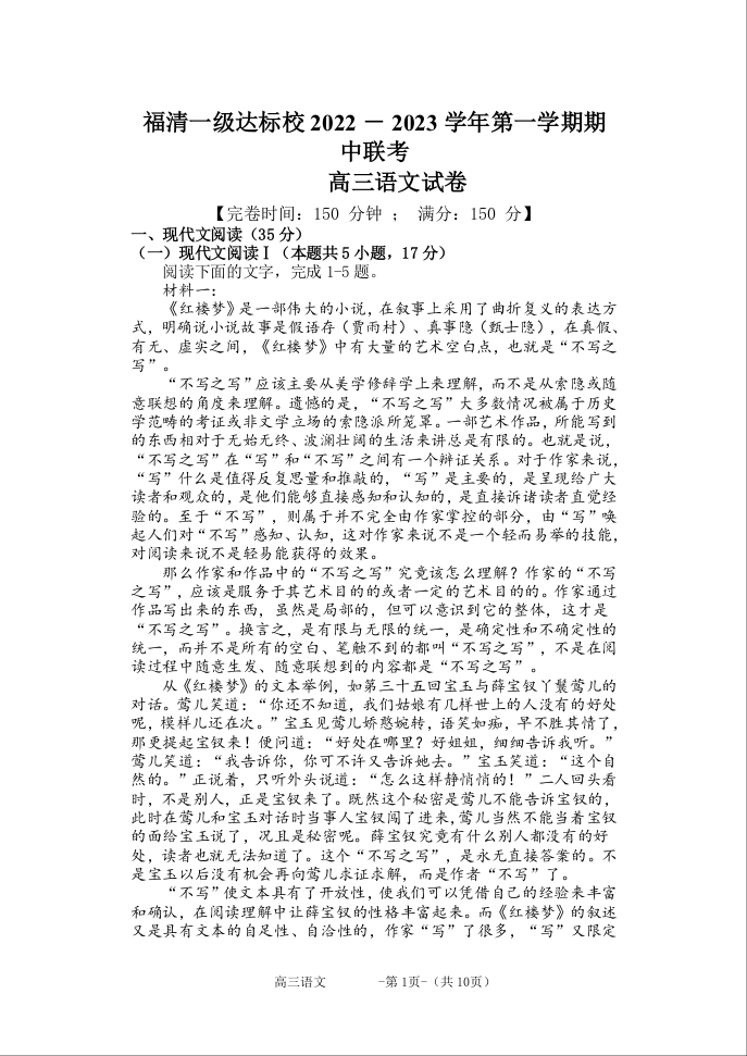 高三语文--福建省福清市一级达标校2023届高三上学期期中联考