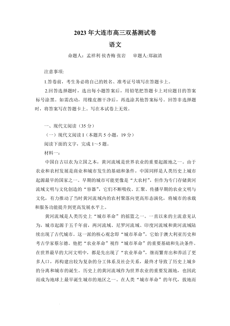 高三语文--辽宁省大连市2023届高三上学期期末双基考试