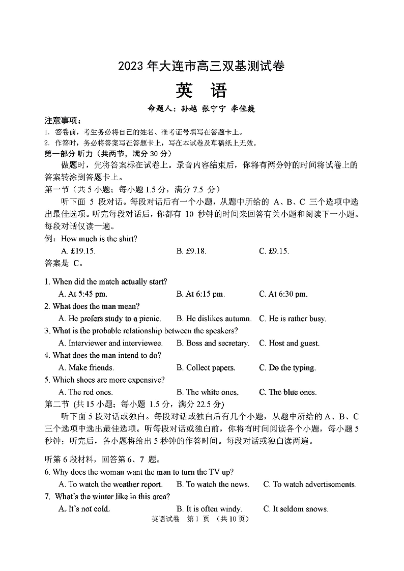 高三英语--辽宁省大连市2023届高三上学期期末双基考试