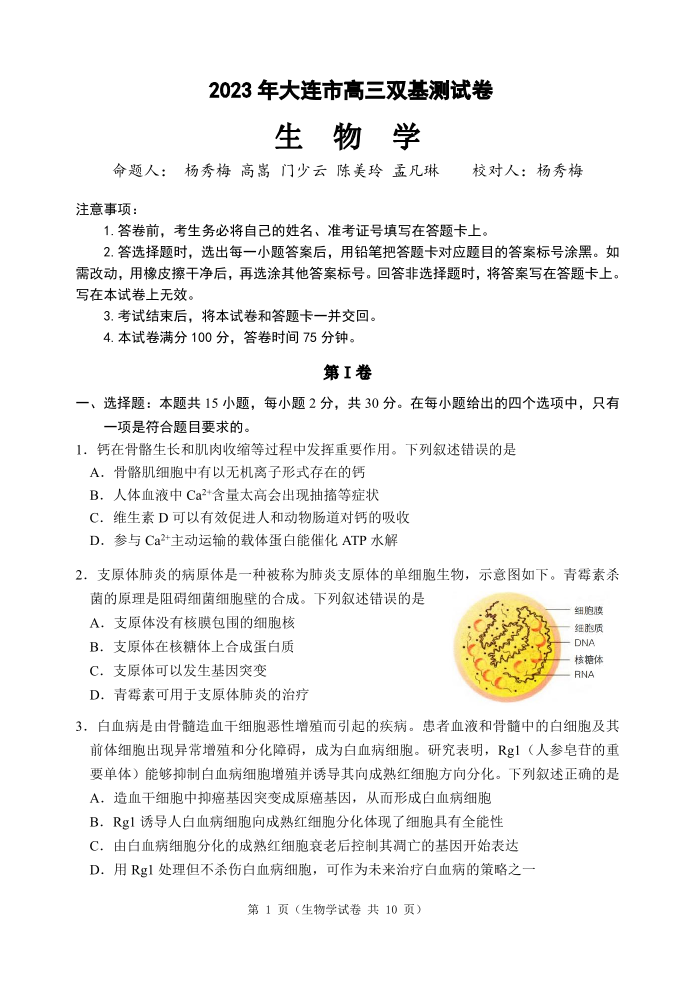 高三生物--辽宁省大连市2023届高三上学期期末双基考试