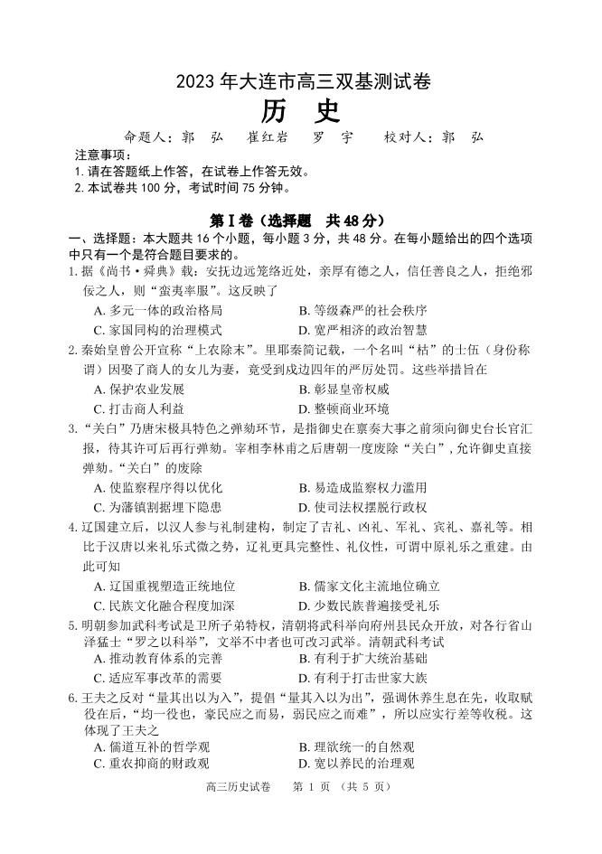 高三历史--辽宁省大连市2023届高三上学期期末双基考试