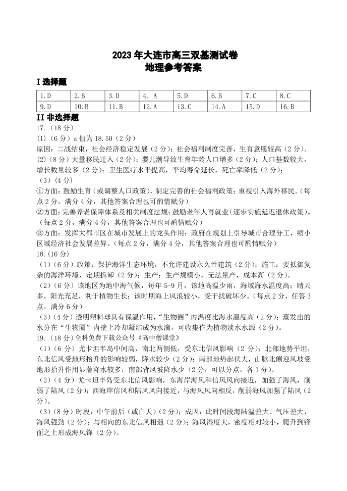 高三地理答案--辽宁省大连市2023届高三上学期期末双基考试