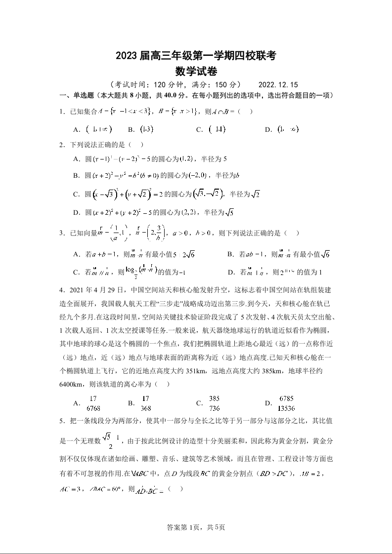 高三数学--江苏省盐城市四校2022-2023学年高三上学期联考