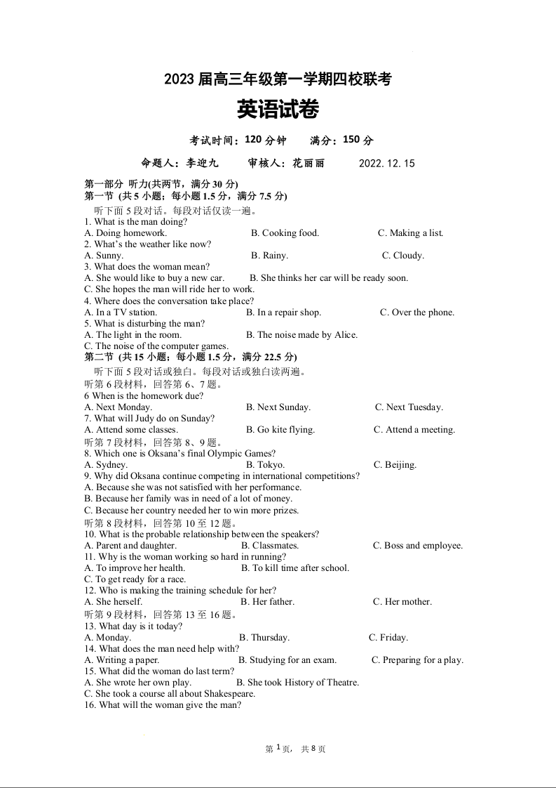 高三英语--江苏省盐城市四校2022-2023学年高三上学期联考