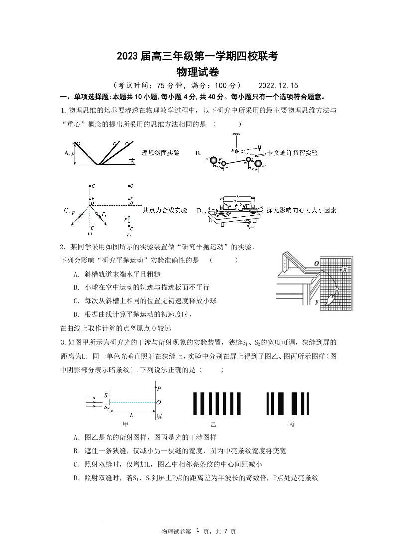 高三物理--江苏省盐城市四校2022-2023学年高三上学期联考