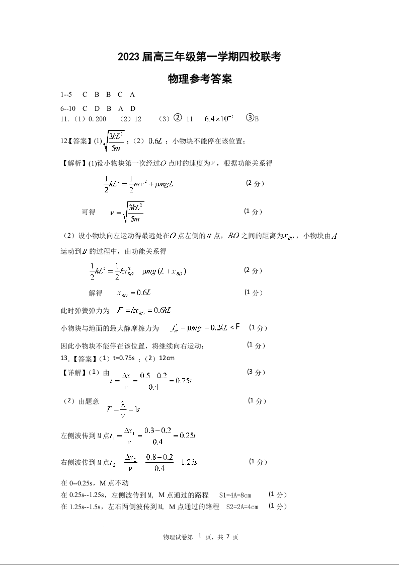 高三物理答案--江苏省盐城市四校2022-2023学年高三上学期联考