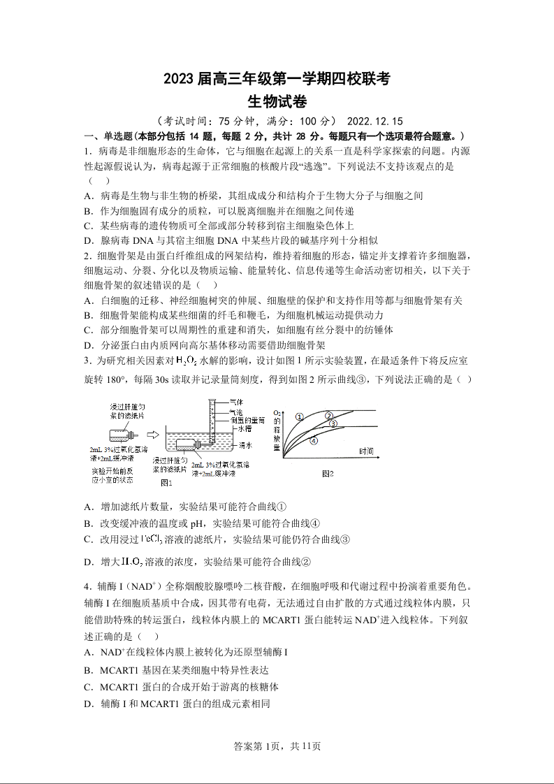 高三生物--江苏省盐城市四校2022-2023学年高三上学期联考