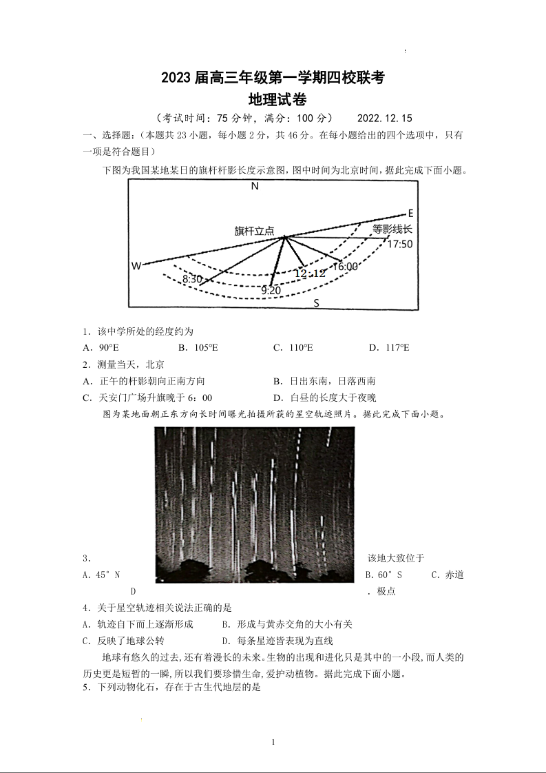 高三地理--江苏省盐城市四校2022-2023学年高三上学期联考