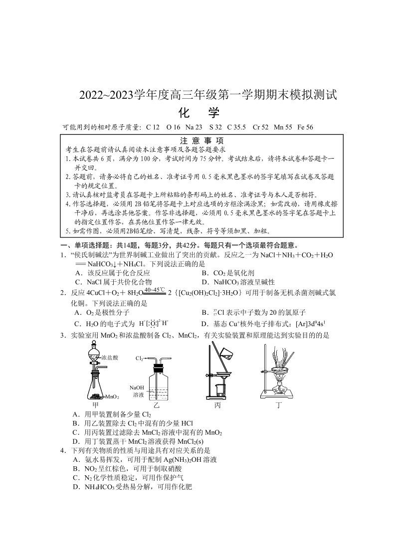 高三化学+答案--江苏省徐州市2022-2023学年高三上学期期末模拟测